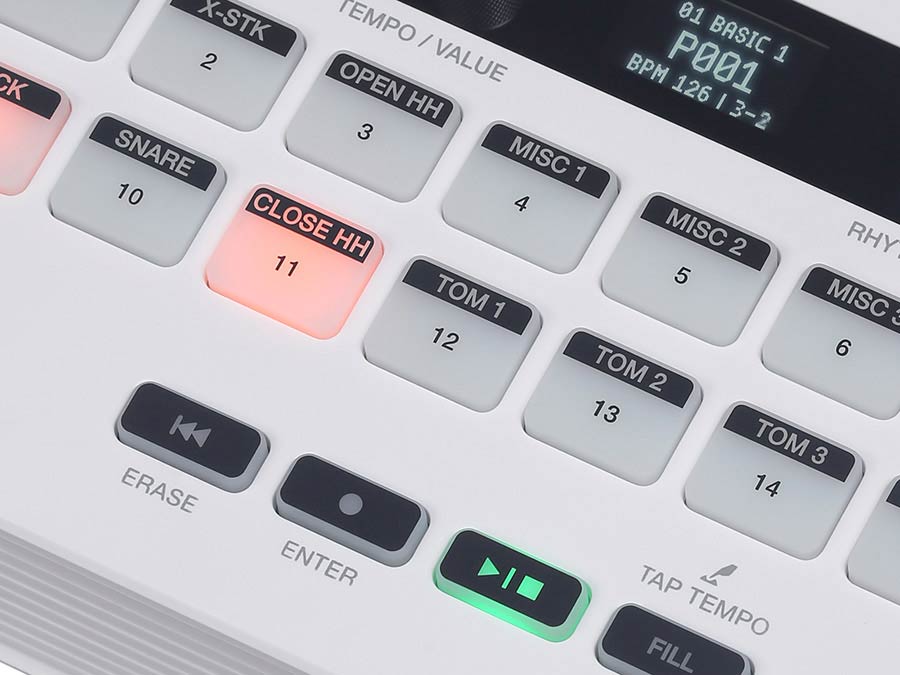 | panel control | power • fill-in button playhead button • volume • tempo/value rhythm select • kit select • pattern/song mode select playhead (rewind) • record • play/stop • fill • erase enter • tap tempo • function |