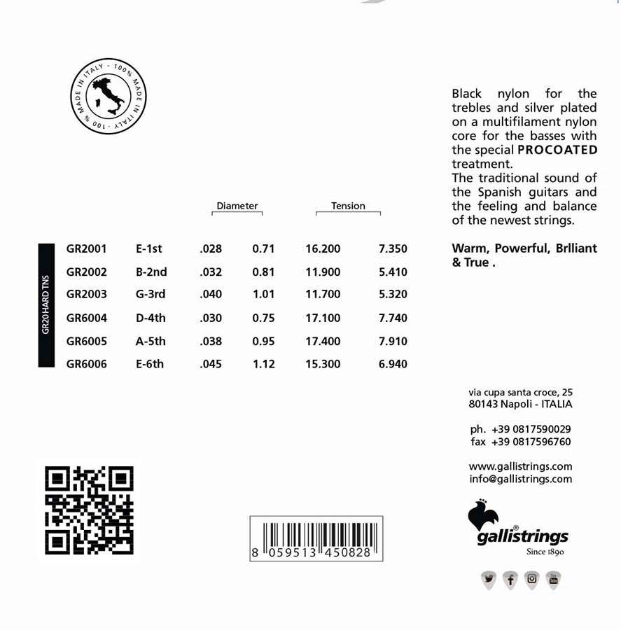 A single crystal nylon wire for the high notes, and covered in silver copper with antioxidizing protection on the multiwire nylon for the low notes.