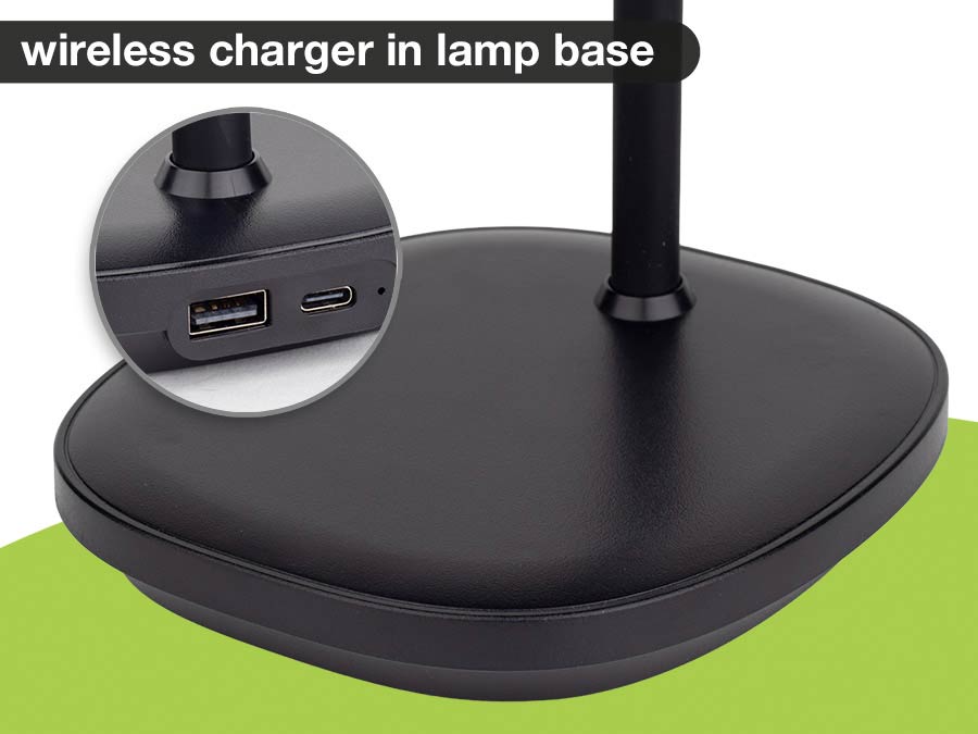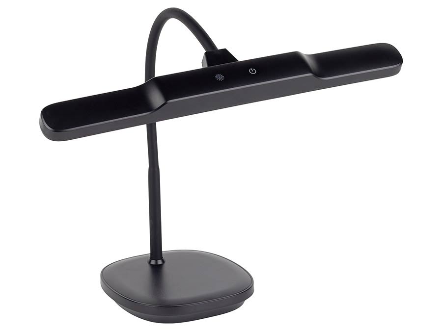 piano LED lamp, adjustable brightness, warm white, black housing, USB charger output 5V. 1A