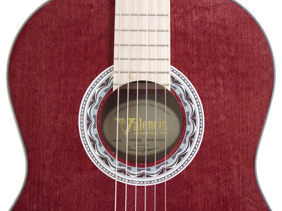 The Valencia 354 brings a fresh look to the classical guitar world. With its vibrant, multi-colored top and matching headstock, this full-size 4/4 guitar has a striking presence. The white fretboard, paired with rich mahogany back and sides, creates a unique contrast that makes the colors stand out even more. But beyond its bold design, the 354 is a solid, comfortable instrument for players who want a reliable classical guitar with a touch of personality.
