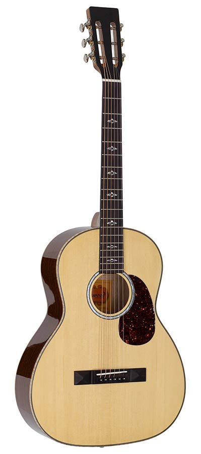 parlor guitar, solid spruce top, mahogany body, flamed maple & abalone, natural gloss