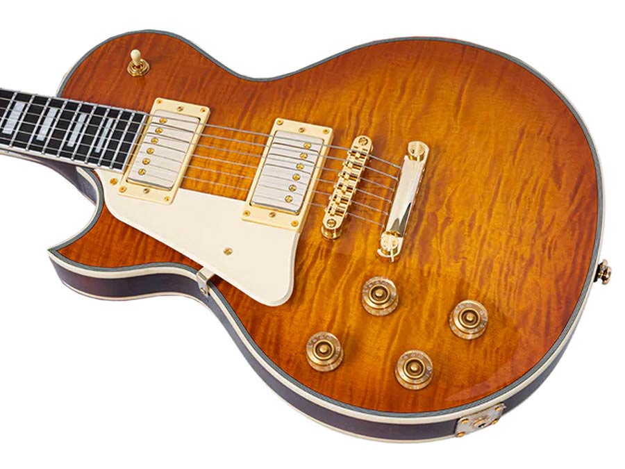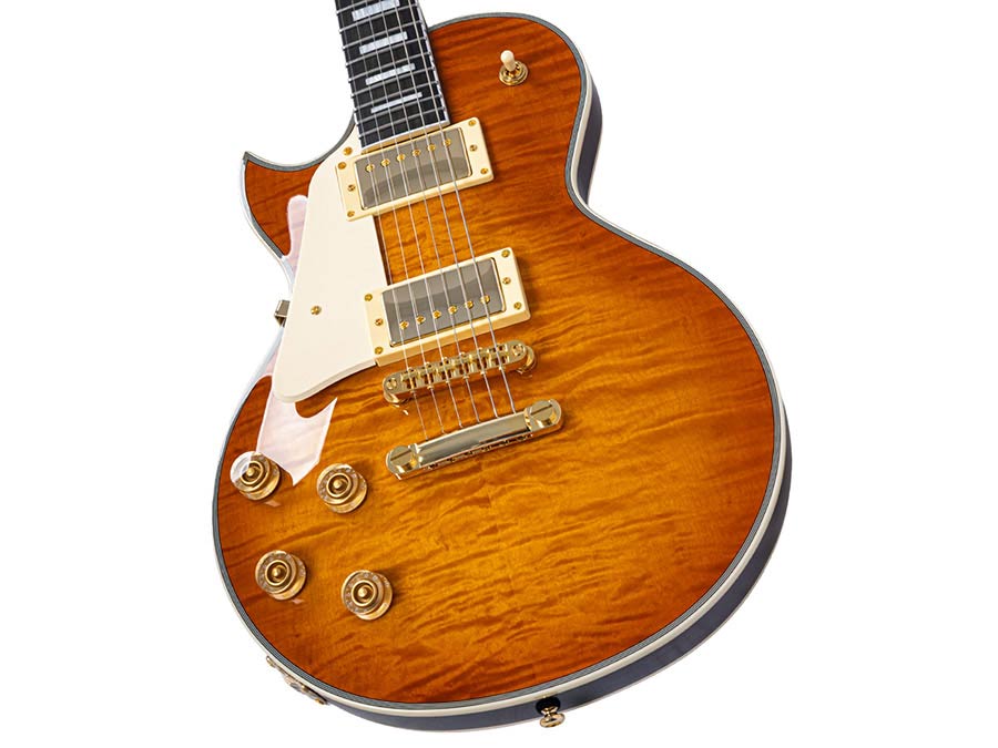 lefty mahogany + maple top + flame veneer electric guitar L-style, amber burst