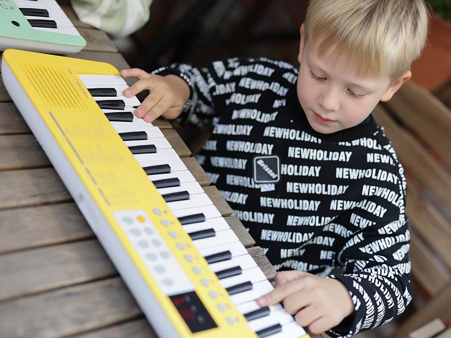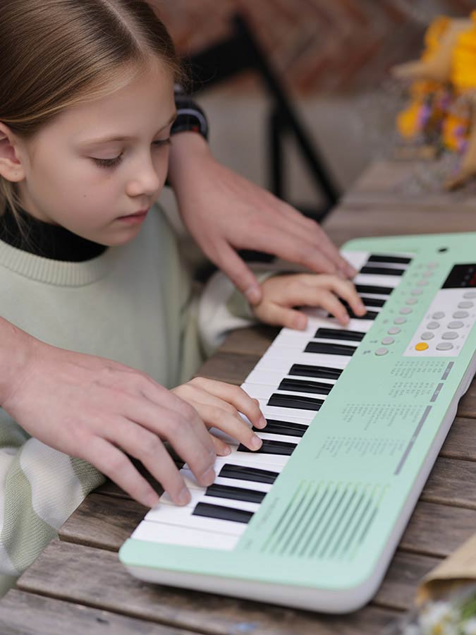 Its small-sized keyboard is easy to play, there are 10 sound buttons with fun graphic icons to give you all the unique sounds from popular musical instruments to ethnic percussion hits to natural sounds, and various built-in rhythm patterns open up children's limitless imagination and interest. It is compact and can be battery-powered to take outside and enjoy playing anywhere.