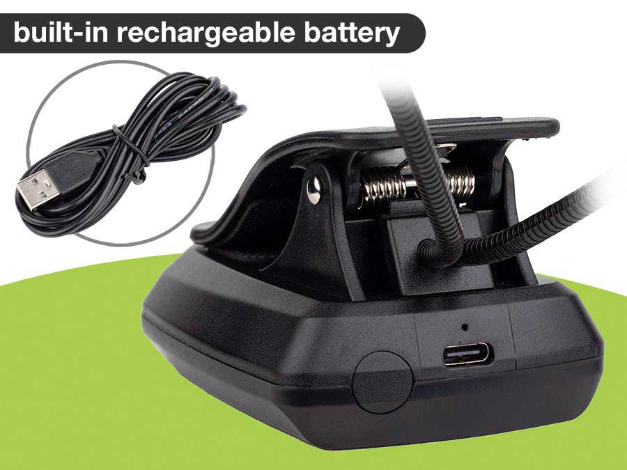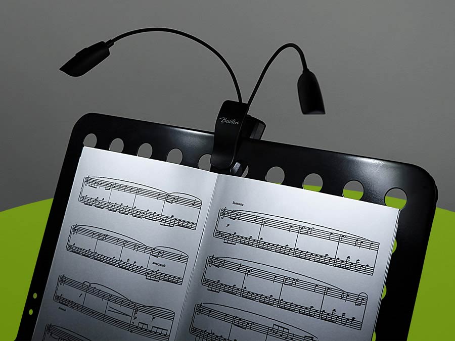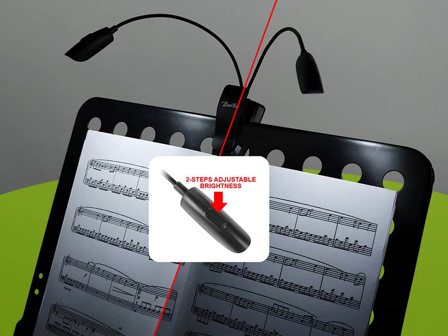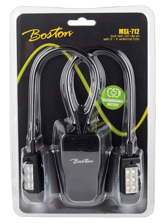 Boston universal music stand lamp with 12 extra bright LED lights (6 in each lamp) that can be switched on and off individually. The lamp has different positions which can be set in cool, warm white and red. The MSL-712 is a very compact and equipped with 2 sturdy flexible goosenecks of 24 cm length that allow for easy positioning. By means of a clip (9 cm x 6 cm x 6 cm) to attach to almost every desk even useable with an integradet magnet. The light is powered built-in rechargeable battery, included 2m charging cable.