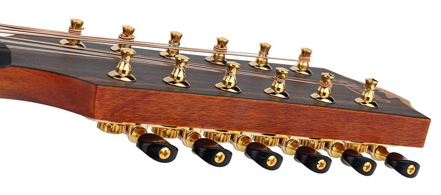 A 12 string guitar with paired strings produces sparkling chimes that you could not get from a standard 6 string guitar. Yet the extra strings could take a heavy toll on the instrument. In standard tuning, a 6 string acoustic guitar exerts about 160 lbs (710 N) of tension while a 12 string guitar can pull up to 250 lbs (1100 N). Many 12 string guitars on the market are simply installed with additional strings without any other structural adjustments and they are doomed to be unplayable and short-lived. I've also seen quite a lot of 12 string guitars being overly constructed with playability and tonal textures being greatly compromised. With our BAT4CE 12 string guitar, I carefully strike a balance to achieve structural integrity and optimum playability and tonal richness.