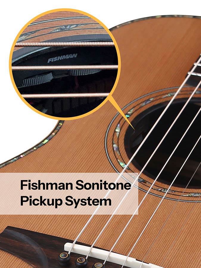 all solid parlor guitar, red cedar top, amara ebony body, Fishman Sonitone, satin, heavy duty bag
