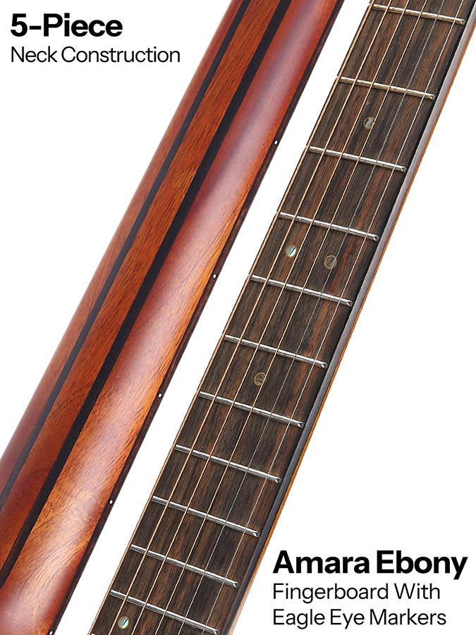 Rocky Mountain Series features an all-solid body with solid red cedar top and solid amara ebony back and sides that advanced players cherish greatly for its full and balanced acoustic tones. The innovative ToneFlow bracing system further increases resonance across the body, creating a wider spectrum of resonances and richer flavors than conventionally braced guitar. A premium mahogany neck is paired with an ebony fingerboard for sleek fretting. Individual setup at factory and meticulous attention to detail ensure a sensational experience.