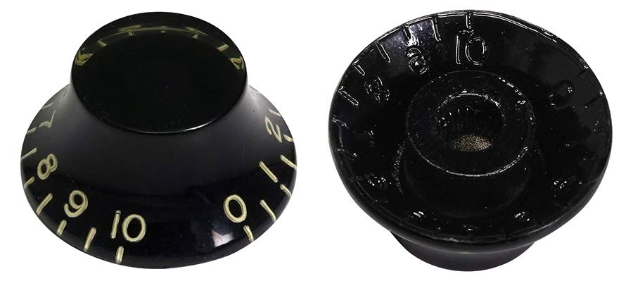Golden speed knobs were commonly used by Gibson in the early 50’s (1953-55). The black ones appeared on both 50’s and 60’s guitars. Golden bell knobs appeared on the 1958-60 LP Standard. Black bell knobs were used in the 50’s and 60’s for several models, amongst others the LP Jr. and Special.