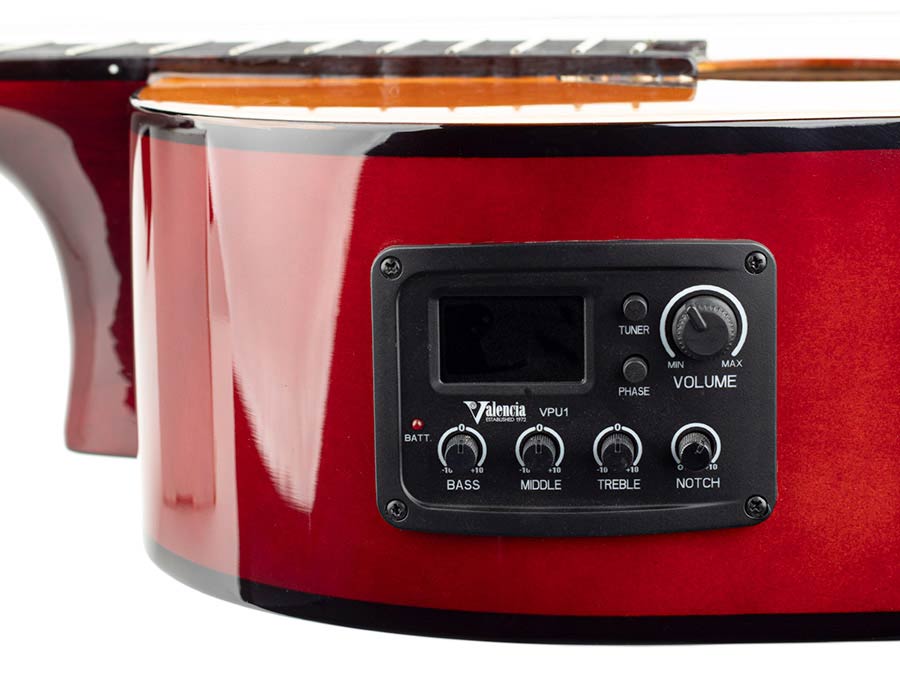 De Valencia 100-series biedt je een heldere klank met snelle respons. Deze gitaar is voorzien van een VPU1 3-Band EQ Preamp met ingebouwde tuner.