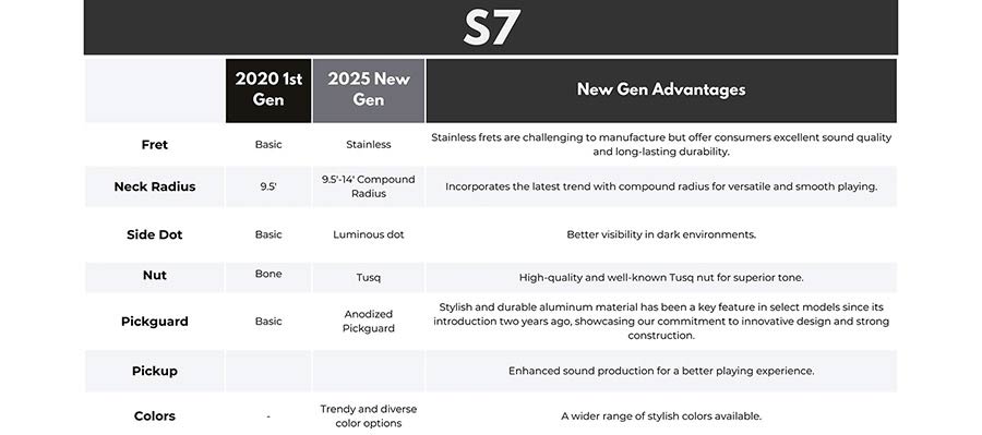 The S7 New Gen is a reimagined version of the existing model, S7. It is charged with significant features to ensure superior performance and stretch to its life span. Its enhanced components featuring the newly tuned Sire Larry Carlton pickup set for refined tonal versatility, stainless frets, some more neck features, and new colors make the playing experience even more exceptional this time.
