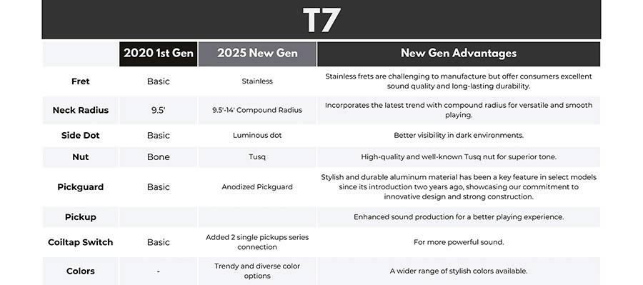 The T7 New Gen is a reimagined Larry Carlton T-style electric guitar, which is now charged with significant features to ensure superior performance and stretch to its life span. Its enhanced components featuring the newly tuned Sire Larry Carlton pickup set for refined tonal versatility, stainless frets, some more neck features, and new colors make the playing experience even more exceptional this time.
