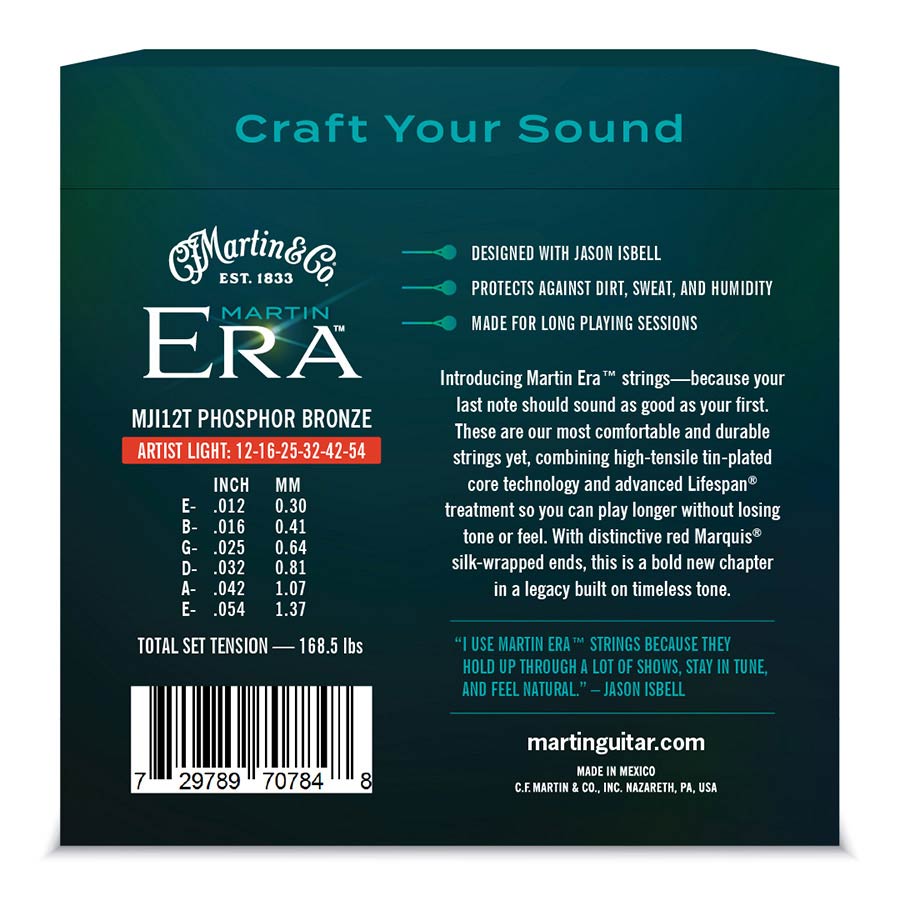 Built to achieve unmatched tone and playability, Martin Era™ strings set a new standard for whata phosphor bronze acoustic guitar string can be. Combining the best technologies from the MartinStrings lineup, Martin Era strings feature a patented Lifespan®treatment to protect against corrosion,Flexible Core construction to enhance fretability and comfort, and silk-wrapped ball ends—designedwith vintage instruments in mind and as a premium touch that symbolizes Martin’s handcrafted string-making history. The Artist Light version was developed in collaboration with six-time GRAMMY®winnerJason Isbell and features a more traditional SP® core to match his signature guitar sound.
