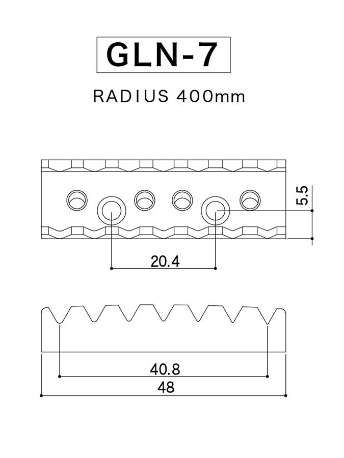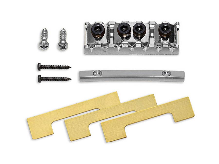 Electric guitar locking nut for seven string guitars. 48 mm width, 40,8 mm string spacing and 16” radius. Nut screws mount from front of neck. Tension bar and mounting screws included.