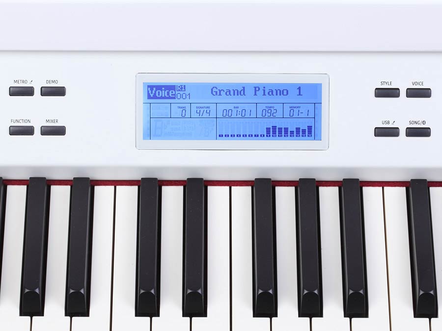 The automatic accompaniment has 270 different styles and has 192 registration memories. To top it all off, the grand piano is equipped with a 16-track sequencer and the recorded songs can be saved as an MP3 file on a USB stick