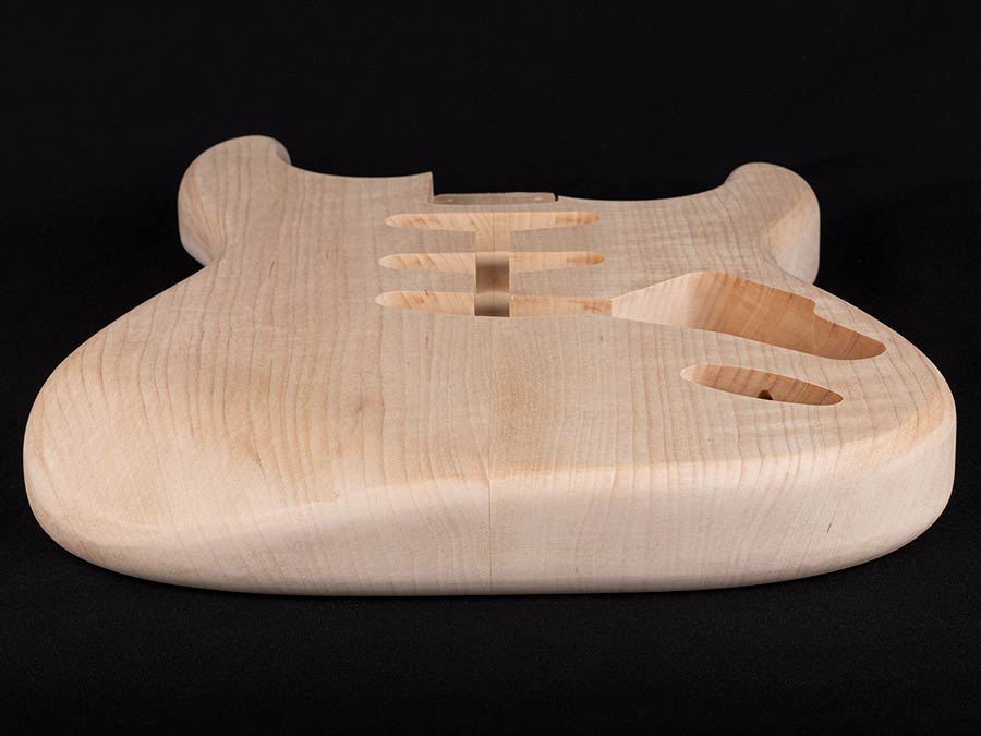Two-pieced bodies were mostly used for early electric guitar production before bodies were made from more pieces to save costs. It lends itself well for semi-translucent finishes like sunburst, blonde and other colours based on wood stains under a transparent top coat.