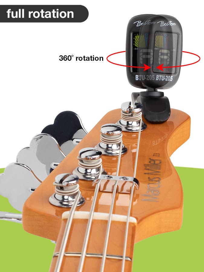 The Boston BTU-205 is a neat clip-on tuner with a full colour display and several tuning options: chromatic, guitar, bass, violin and ukulele. The selected mode will be memorized for future usage.
