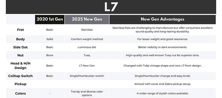 The L7 New Gen is a reimagined version of the single-cut Larry Carlton electric guitar, L7. It is charged with significant features to ensure superior performance and stretch to its life span. Its enhanced components featuring the newly tuned Sire Larry Carlton pickup set for refined tonal versatility, stainless frets, some more neck features, and new colors make the playing experience even more exceptional this time.